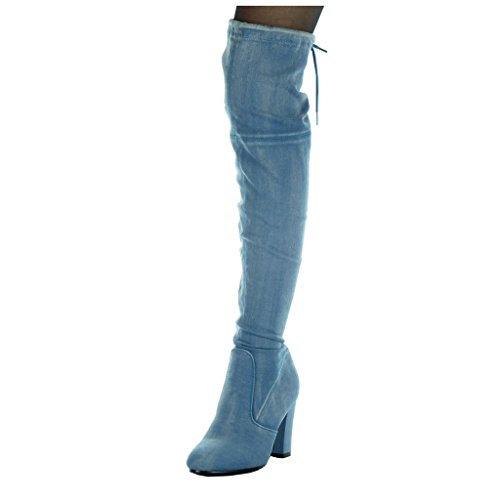 ANGKORLY - Scarpe da Moda Stivali Alti Cavalier Jeans Denim Flessibile Donna Tacco a Blocco Tacco Alto 8.5 CM