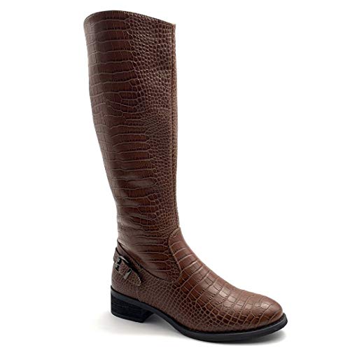 ANGKORLY - Scarpe Moda Stivali - Scarponi Cavalier Biker Biker Donna Effetto Pitone Pitone Stampa Animalier Coccodrillo Tacco a Blocco 4 CM - Marrone BH311 T 39