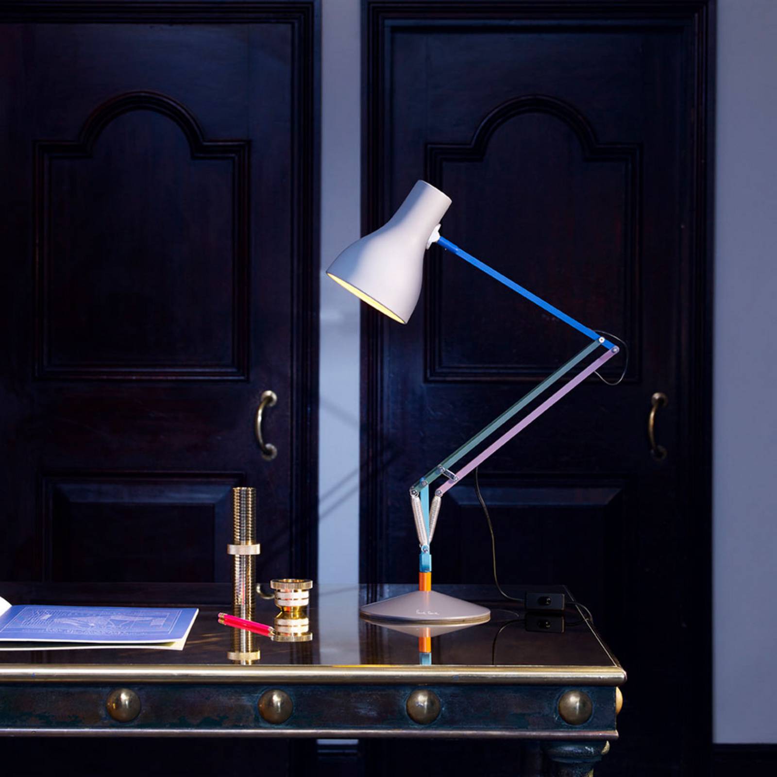 Lampada da tavolo a LED Tipo 75 Mini - Edizione Paul Smith In accattivanti combinazioni di colori e dotata delle stesse funzioni dell'omonima lampada da tavolo di grandi dimensioni, la lampada da tavolo Type 75 Mini di Anglepoise® si presenta con un design accattivante. È inoltre dotato del noto meccanismo a molla costante per la massima libertà di movimento e l'equilibrio, che lo rende indispensabile sulla scrivania privata o aziendale. La lampada da tavolo Type 75 Mini è stata introdotta nel 2011 su progetto del designer industriale britannico Sir Kenneth Grange, che ha già concepito prodotti per molti marchi famosi, come Tesco, Tiffany & Co, Nike, Kodak e Parker, ed è responsabile del design esterno dell'InterCity 125 inglese. Lo stilista inglese Paul Smith, famoso in tutto il mondo per le sue coloratissime collezioni di moda maschile, ha dato alla Type 75 Mini un nuovo look, con colori estivi, ricchi toni autunnali o nello stile del p