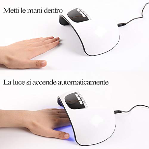 ❤【Rilevamento automatico intelligente】La lampada UV / LED per unghie si accenderà / spegnerà automaticamente quando la tua mano è dentro / fuori. Con il sensore intelligente, il processo di polimerizzazione automatizzato può essere avviato senza operazioni manuali. La nostra luce UV può essere impostata in 3 impostazioni del timer di 30s / 60s e un'impostazione automatica in modalità 99s a bassa temperatura. costruzione veloce, molto efficiente e durevole.