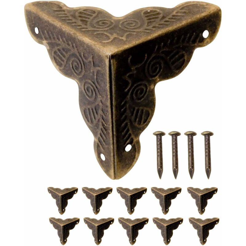 10 pezzi di angoli di protezione dei bordi in ottone in aspetto antico vintage, inclusi 40 chiodi assortiti per scatole, guide per mobili, cassettiere, - Protegge gli angoli e dona un aspetto antico / Basta inchiodare gli angoli Dimensioni: 25 mm x 25 mm x 25 mm, chiodi 10 mmFornitura: 10 angoli, 40 chiodi