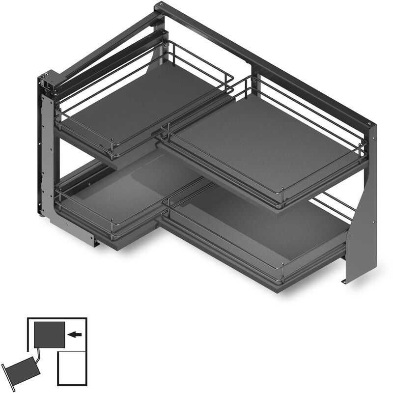 Titane Angle è un mobile angolare estraibile per mobili da cucina. È progettato per sfruttare al meglio lo spazio dei mobili ad angolo. Ha una portata totale di 35 kg tra i 4 cestelli, è dotato di un sistema di chiusura morbida e di una regolazione tridimensionale del bordo che ne facilita il montaggio. La struttura è in acciaio e rifinita in grigio antracite. I 4 cestini sono in acciaio con fondo melaminico anch'esso grigio antracite. Per l'installazione si consigliano dimensioni interne minime: larghezza minima 862 mm e profondità minima 495 mm. Il mobile ad angolo è disponibile per sistemi di apertura a destra o a sinistra, a seconda del riferimento scelto. Angolo estraibile a cerniera per mobili da cucina con apertura a sinistra. Il set è composto da un telaio e 4 cestini. Il sistema prevede la chiusura morbida dell'anta e la regolazione tridimensionale del bordo. Misure minime del modulo interno consigliate per l'installazione: larghezza 862 mm e profondità 495 mm. Ha una