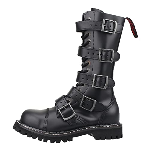 Angry Itch - 14-Fori Nero Vera Pelle Anfibi Allacciati Militari con 5 Fibbie & Zip - Taglie 36-48 - Made in EU!