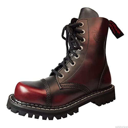ANGRY ITCH - 8 fori Burgundy Red Rub-Off Gothic Punk Army Ranger Stivali in pelle con punta in acciaio, Multicolore (Burgundy Rub Off.), 41 EU