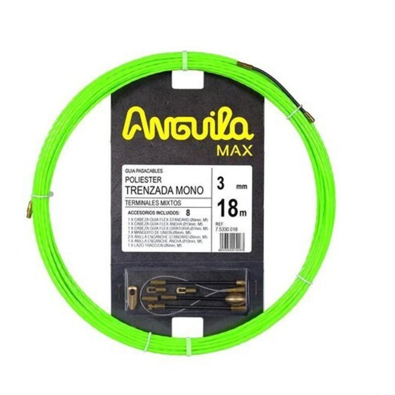 Passacavo intrecciato monofilamento Ø 3 mm e lungo 18 metri, colore verde fluoro, provvisto di terminali misti e 8 accessori. Il materiale intrecciato monofilamento è più flessibile e ha meno attrito in curva, offrendo migliori prestazioni di forza di torsione rispetto al poliestere intrecciato, grazie alla sua durezza e rigidità trasmette una maggiore forza di spinta permettendogli di raggiungere distanze maggiori. Il suo diametro gli permette di essere una guida particolarmente indicata per tubi stretti o con cavi.