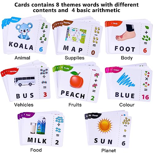 ✍ 【Ben progettato】Il giocattolo è ben progettato per dimensioni, colore e contenuto. Le carte contengono 8 temi diversi, tra cui animali, colori, cibo, frutta, corpo, veicoli, forniture e pianeti.Contengono anche le 4 operazioni aritmetiche di base, inclusa l'addizione, la sottrazione, la moltiplicazione e la divisione.