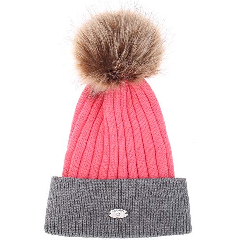 AnJuHoPa Cappelli lavorati a maglia di cristallo Berretto soffice Fodera in pile Cappello invernale staccabile con pompon in pelliccia sintetica per donna Taglia regolare rosa grigio