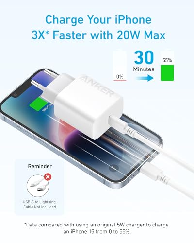 Anker 20W Caricabatterie USB C, caricabatterie da parete Anker USB-C, compatibile con iPhone 15 / iPhone 15 Plus/iPhone 15 Pro/iPhone 15 Pro Max/iPad Pro e altri (con cavo USB-C da 150 cm)