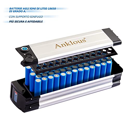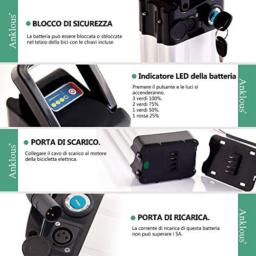 {Batterie batteria premium e caricabatterie rapido 3A}La batteria per bicicletta elettrica Anklous 36V/10Ah è composta da celle di grado automobilistico agli ioni di litio 18650 40.La batteria ha una durata del ciclo di carica.Più di 1000 ~ 1200 volte e il la durata è fino a 5 Corrente di scarica costante massima:20A.Questo pacco batteria per bicicletta elettrica è dotato di un potente caricabatterie da 36V 3A e sono necessarie solo circa 3-4 ore per ricaricare completamente la batteria.