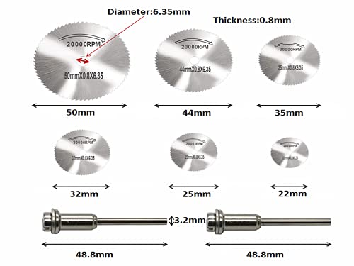 La Confezione Include: 6 Pezzi dischi da taglio HSS, disponibili in 6 diverse dimensioni, nonché 2 aste di prolunga (3,2 mm) e 6 mm. Il gambo cilindrico viene utilizzato per un bloccaggio stabile e un centraggio preciso.
