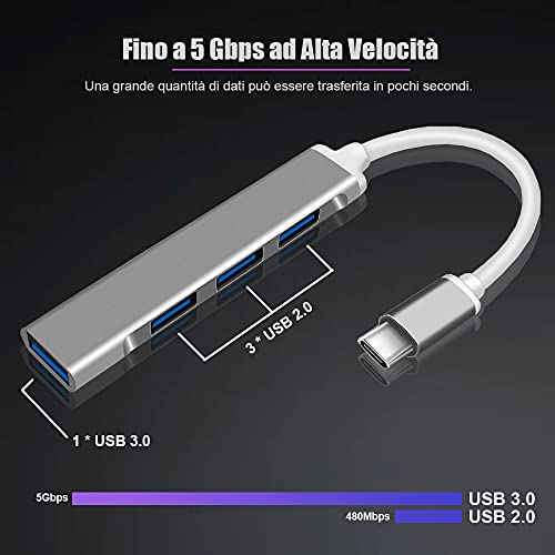【Hub USB C 4 in 1】L'adattatore hub USB C espande la porta USB-C del laptop a 4 porte (1 porta USB 3.0, 3 porte USB 2.0). Collega gli altri 4 dispositivi USB al laptop, come dischi rigidi mobili, mouse, tastiere, lettori di schede e altri dispositivi USB per soddisfare facilmente le esigenze quotidiane.