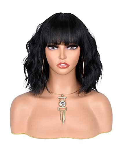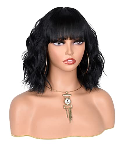 ANNIVIA Parrucche corte Bob con Air Bangs per donne ricci ondulati sintetici Cosplay lunghezza spalla parrucca Bob parrucca per ragazze quotidiana (nero)
