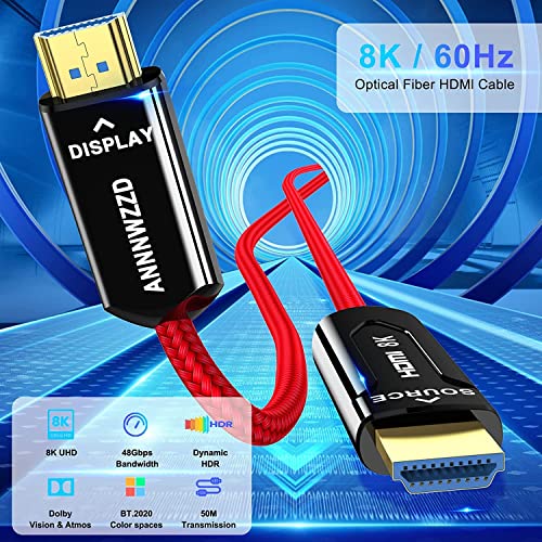 ANNNWZZD Cavo Fibra Ottica HDMI 8K,Cavo HDMI 2.1 8 K @60 Hz 4 K @120 Hz,Supporta 48Gbps Dynamic HDR 10, eARC, HDCP2.2, 4:4:4 (rosso intrecciato) (50M)