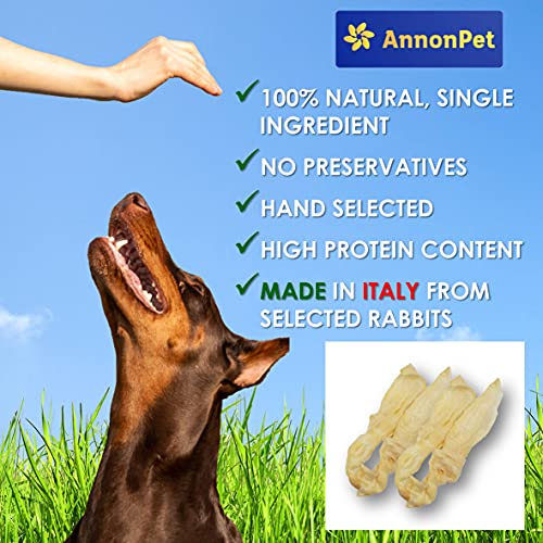 ANNONPET 250 Grammi (22 Pezzi) di Orecchie di Coniglio senza Pelo a Basso Contenuto di Grassi | Spuntino da Masticare per Cani | Ideale per Dieta Barf | Made in Italy