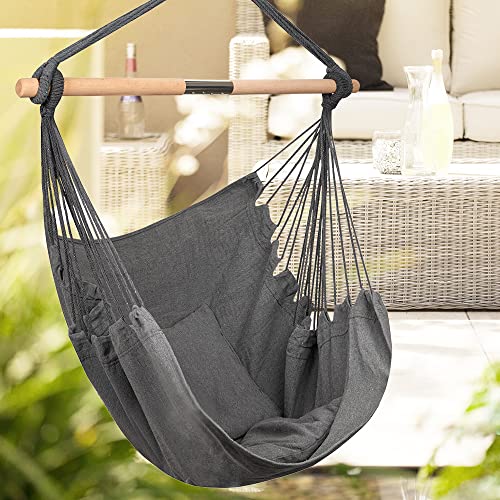 ANPPEX Sedia Amaca Sospesa, con 2 Cuscini Extra e Barra di Supporto in Legno, Poltrona Sospesa Amaca Pensile Sedia a Dondolo Appesa per Interno Esterno Giardino Terrazzo Balcone Campeggio