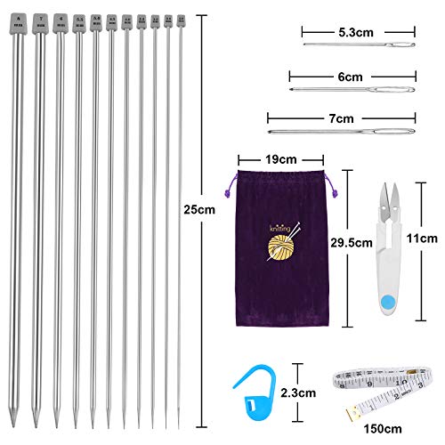 La Confezione Include: 22 pezzi (11 paia) ferri da maglia, 12 uncinetti, 10 segnapunti per maglia, 9 ferri smussati a occhi grandi, 1 forbice, 1 metro a nastro e 1 custodia. Regalo utile ideale per mamma, bambini, ragazze, studenti universitari, principianti ecc.