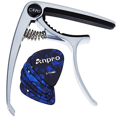 Anpro - Set di capotasto per chitarra, in color argento, con 6 plettri, di dimensione: 0,46 (3 pezzi) e 0,71 mm (3 pezzi)
