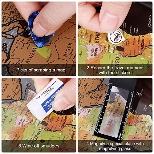 Compreso abbondanti accessori per fare un lavoro perfetto, tre strumenti per grattare possono essere scelti, adesivi e bandiere colorate ti aiuteranno a registrare dove sei stato o hai intenzione di andare, diversi chiodi e nastro biadesivo potrebbero fissare la mappa ovunque ti piace.
