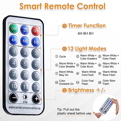 12 modalità di illuminazione: facile commutazione tra loop, bianco caldo + gradiente, bianco caldo + flash di colore, bianco caldo + colorato, bianco caldo + burst, bianco caldo + mix di colori, bianco caldo Keep On, flash bianco caldo, flash lento bianco caldo, costante di colore, flash di colore e flash lento di colore tramite telecomando.