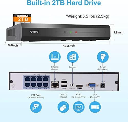 Anpviz 4K NVR PoE 8 Canali con 2TB HDD, [Solo Plug & Play con Anpviz U Series] 8CH Sistema di Sorveglianza con Videoregistratore H.265, Registrazione 24/7, Guard Station Guard Viewer