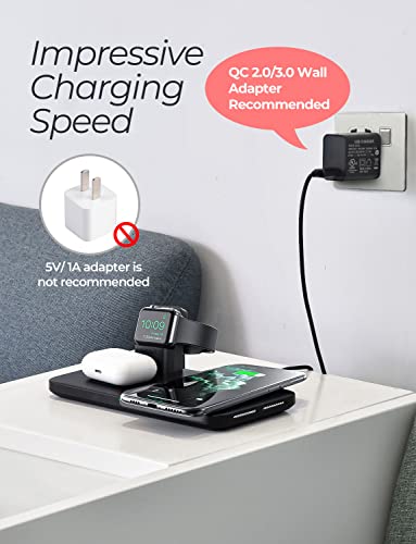 Una nuova esperienza di ricarica: il caricabatterie wireless 3-in1 è compatibile con tutti i telefoni e le cuffie wireless abilitati. Basta mettere il telefono e gli auricolari sul pad di ricarica wireless, i dispositivi si sveglierebbero rapidamente. La ricarica veloce è supportata dall'adattatore a parete QC 3.0, non incluso nella confezione. L'adattatore 5W non funzionerebbe correttamente.