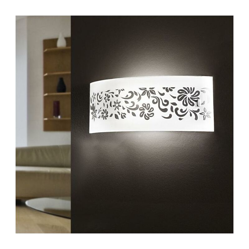 Applique da parete per interno, in vetro bianco con decoro floreale wenge' e fermavetro nickel satinato;