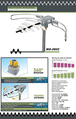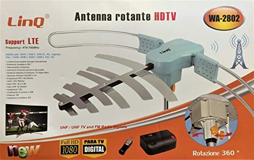 Antenna TV DVB-T2 Rotante WA-2802, HDTV Antenna Amplificata con Rotazione 360°, Antenna con telecomando a distanza, Antenna con Amplificazione 30dbi 3W