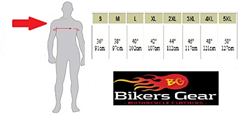 Dimensioni per adattarsi con giacca in pelle sotto - se si indossa solo T-Shirt sotto Go down One Size - 91,4 cm Med 96,5 cm LRG Fit vestibilità piccola 101,6 cm XL misura 106,7 cm 2 x l 111,8 cm 3 x l Fit 116,8 cm 4 x l 121,9 cm 5 x L fit & 6 x l Fit 132,1 cm