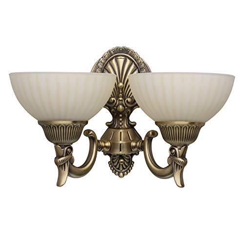 Questa bellissima applique classica a 2 baccia doppia in ottone con paralumi di vetro opachi può essere posizionata in camera da letto, soggiorno, sala da pranzo oppure cucina