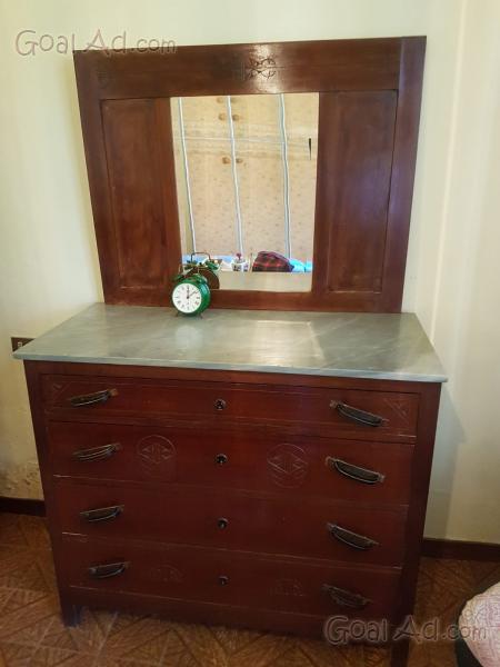 Comò con specchiera originale 800, con base composta da n. 4 cassetti e piano in marmo (anche le maniglie sono originali), parte superiore con specchio centrale. Ottime condizioni. Misure della base: larghezza cm 108, profondità cm 53, altezza cm 99. Misure della parte superiore-specchiera: larghezza cm 101, altezza cm 78,5. Si valutano offerte.