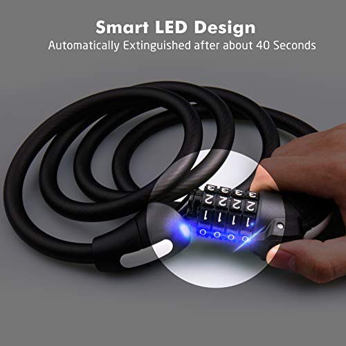 Omew Bike Lock con luce LED, bici antifurto, cavo di sicurezza, lucchetto con combinazione a cifre azzerabile codice e staffa di montaggio per bicicletta scooter outdoors-black