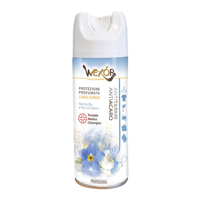 Antitarme Antiacaro Narciso Blu Protezione Profumata di Lunga Durata Narciso Blu e Fiori di Cotone Lo spray Antitarme Antiacaro Narciso Blu Wexór è un Presidio medico Chirurgico certificato dal ministero della Salute. Garantisce un guardaroba sempre protetto e profumato! Ideale per capi d'abbigliamento, tende, tappeti, cuscini, materassi etc. Modo d'uso Azione Antitarmica: Spruzzare il prodotto sui capi e sui tessuti da proteggere agendo in modo uniforme mantenendo una distanza di circa 30 centimetri. Azione Antiacaro: Spruzzare uniformemente da una distanza di circa 30 centimetri. Erogare il prodotto uniformemente per 20 secondi al metro quadro. Per un'azione antiacaro preventiva e profonda si consiglia l'utilizzo dell'aspirapolvere dopo 1 ora dal trattamento per eliminare gli acari morti. Per moquette e tappeti molto sporchi e impolverati si consiglia di aspirare e/o lavare con vapore prima del trattamento.