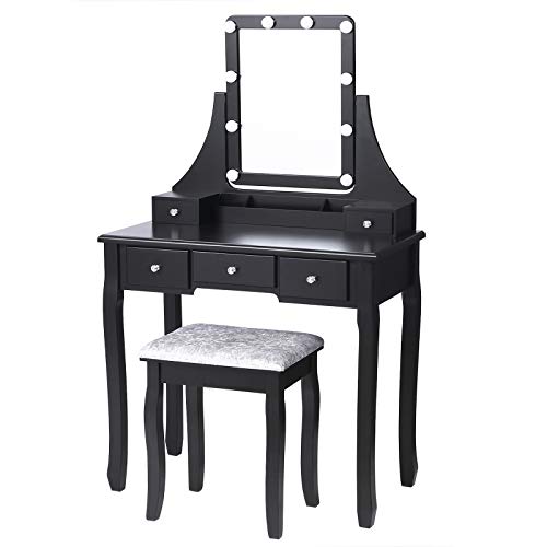 ANWBROAD Tavolo Cosmetici Vanity toeletta LED Toletta tavolino da Trucco con Sgabello Tavolo per Cosmetici specchiera 10 lampadine tavolo per acconciature 5 cassetti 2 organizzatori Nero BDT04B