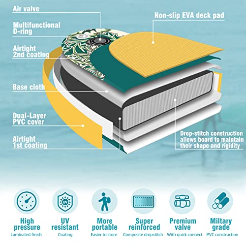 Robusta, Stabile e Facile da Manovrare - La tavola è realizzata in PVC a doppio strato e pad antiscivolo in EVA, adotta una tecnologia avanzata con cucitura drop-stitch che rende la tavola più rigida quando gonfiata e ne impedisce il rigonfiamento nel mezzo. Super resistente e molto stabile, perfetta per i utilizzatori di tutti i livelli per manovrare facilmente la tavola.
