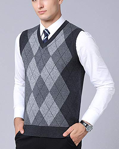 AnyuA Pullover Gilet Smanicato Maglione da Uomo con Rombi e Scollo a V Maglia Grigio Scuro XL