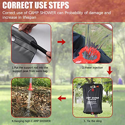 【Come usare】 Il doccia campeggio riscaldata è molto comodo da usare. Inserire l'asta di compensazione nell'apertura ovale sopra la borsa, quindi chiudere il rubinetto, aprire il tappo di riempimento rosso per riempire d'acqua e chiuderlo alla cintura all'attaccapanni.