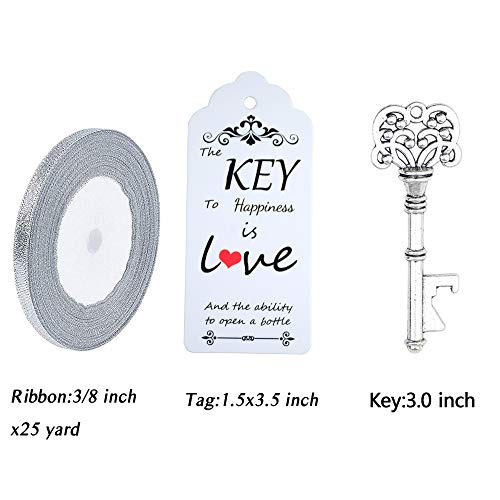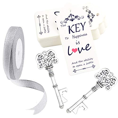 Aokbean 52pcs Antico Rustico Vintage Scheletro Chiave Apribottiglie Bomboniera Ospite Regalo Souvenir Set con Scorta Carta e Nastro di Ringraziamento (Argento Antico)