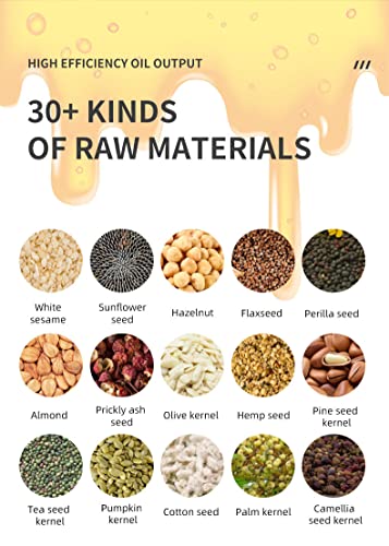 【Ampia applicazione】 Il frantoio è adatto per più di 30 tipi di materie prime, arachidi, sesamo, girasole, lino, nocciola, perilla, colza, semi di tè, nocciolo di noce, mandorla, nocciolo di cenere spinoso, nocciolo di oliva, canapa, pinolo, semi di soia, semi di zucca, semi di pa