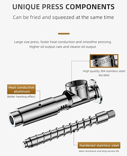 【Controllo intelligente e riscaldamento efficiente】 Sistema di controllo intelligente integrato che offre una maggiore velocità di uscita dell'olio. Riscaldatore ad alte prestazioni con componenti di pressatura esclusivi per un riscaldamento rapido, così puoi friggere e spremere i semi contemporaneamente in un solo passaggio, comodo e veloce! L'innovativo design della fibbia facilita lo smontaggio e rende la pulizia meno difficile.