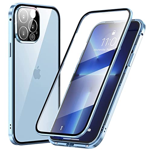 Aolggcol Cover per iPhone 13 Pro Max Custodia 360 Gradi Cover Adsorbimento Magnetica 3-in-1 Case con Copri Fotocamera, Doppio Vetro Temprato Trasparente Metallo Flip Full Body Protezione, Blu