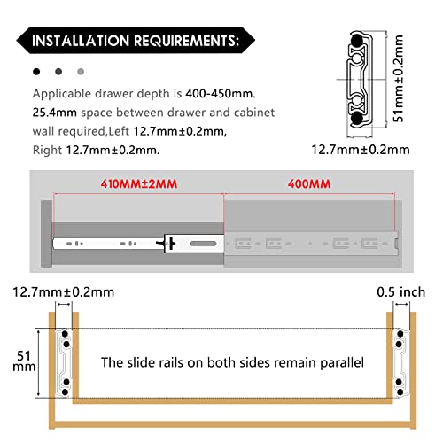 Guida per cassetti con montaggio laterale: quantità: 1 paio (confezione da 2) senza viti. Cuscinetto di carico: 68kg. Lunghezza: 400 mm. È possibile scegliere la dimensione delle guide in base alla profondità del cassetto. *La lunghezza della diapositiva deve essere ≤ la lunghezza del cassetto. Distanza di installazione: 12,7 mm (ciascuno).