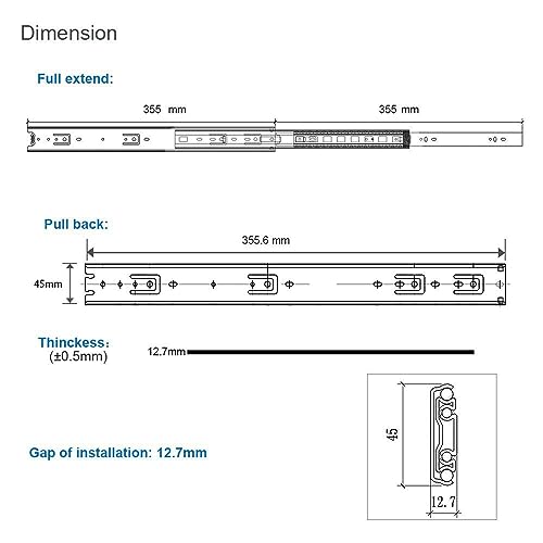 Estensione completa: lunghezza: 350 mm, lunghezza di estensione completa: 702 mm. Distanza montaggio lato sinistro: 0,5" (12,6 mm), distanza montaggio lato destro: 0,5" (12,6 mm). Ci sono 8 viti nella scatola di carta su entrambe le estremità del prodotto. Si prega di spingere prima il cuscinetto a sfera interno alla parte superiore della guida di scorrimento, quindi collegarlo con la guida di scorrimento. Ci sono istruzioni di installazione elettronica nella parte inferiore del link.