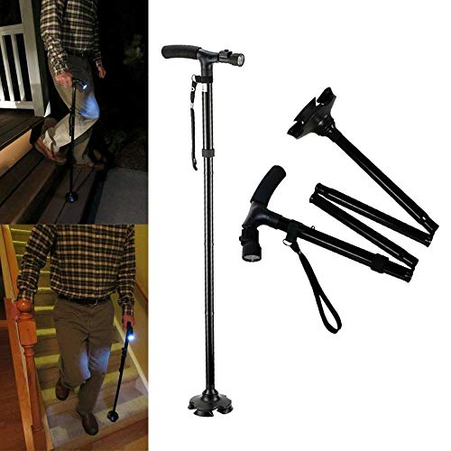 Aolvo - Bastone da passeggio pieghevole con luce a LED, resistente e regolabile in altezza, unisex, con manico a T in lega di alluminio e base antiscivolo, colore: nero