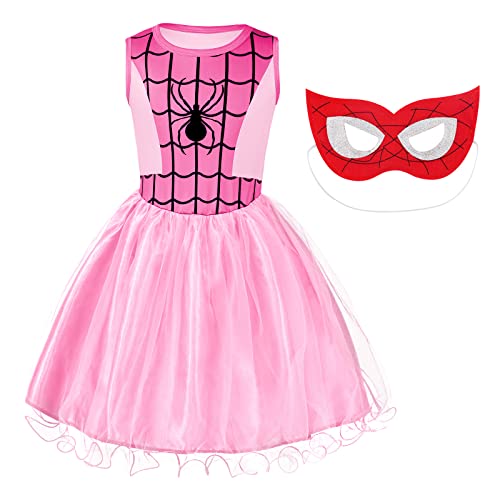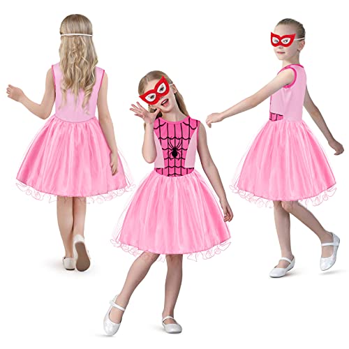 Aomig Costume Supereroe Bambina, Vestito Spider Man Bambini con Maschere, Costume Cosplay di Halloween Spider Dress per Ragazze, Party Fancy Dress per Natale, Carnevale e Compleanno(Rosa,130CM)