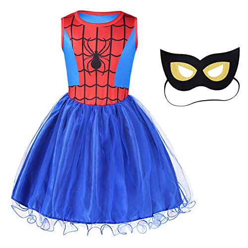 Aomig Costume Supereroe Bambina, Vestito Spider Man Bambini con Maschere, Costume Cosplay di Halloween Spider Dress per Ragazze, Party Fancy Dress per Natale, Carnevale e Compleanno(Blu,100CM)