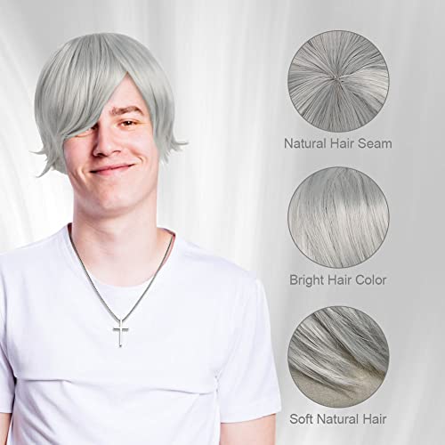 AOMIG Parrucca Uomo, 3Pcs Cosplay Capelli Corti Parrucca Corto Lisci con Collane e Retine Capelli, Parrucca Cosplay Anime Sintetico Cosplay Festa Parrucche per Halloween(D'argento)