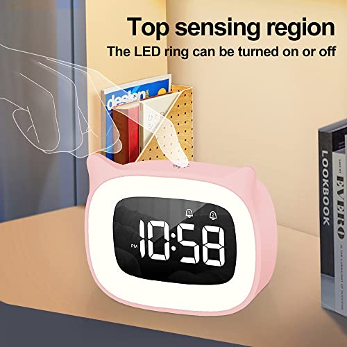 Aoreun Sveglia Bambini da Comodino, Carina Sveglia Gatti, Sveglia Digitale con Led Numeri Grandi, Luce Notturna Funzione Snooze Timer, 18 suonerie, 5 modalità, sveglia comodino per Bambini - Rosa