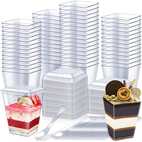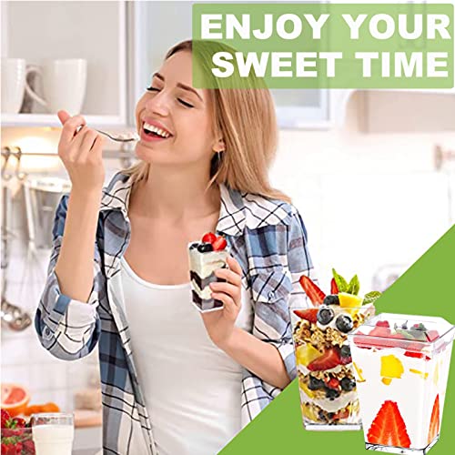 AOTOPYU 50 Pezzi 150 ml tazze bicchieri da dessert con coperchio e cucchiaio Plastica, Finger Food Contenitori Riutilizzabili Trasparenti Coppette da Dessert per Budini, Mousse, Gelati, Matrimoni
