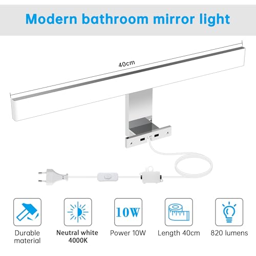 Aourow Lampada Specchio Bagno 10W,400mm 820lm Luce Specchio Bagno LED con Interruttore a Filo,Bianco Neutro 4000k e Resistente all'acqua IP44 Luci Specchio Bagno per Armadietto a Specchio