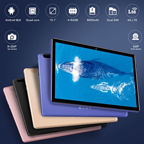 AOYODKG Tablet 10.1 Pollici, Android 10.0 Tablet Offerte Quad-Core 1.4GHz, 4GB RAM + 64GB ROM (TF 128GB), Fotocamera 5+8MP, Dual 4G SIM/SD, GPS, Bluetooth, Type-C, Tablet con Ttastiera e Mouse- Blu